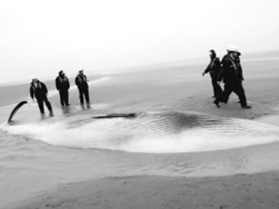 上海渔政有关人员来到横沙东滩检查搁浅的鲸鱼 一头十余米长的鲸近日搁浅在横...