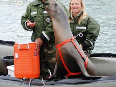 海洋动物在小艇上 海洋动物正在执行水下任务 美国海军利用海洋哺乳动物执行...