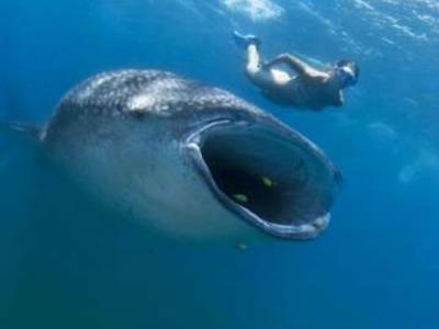 张开大口的鲸鲨在潜水员身后