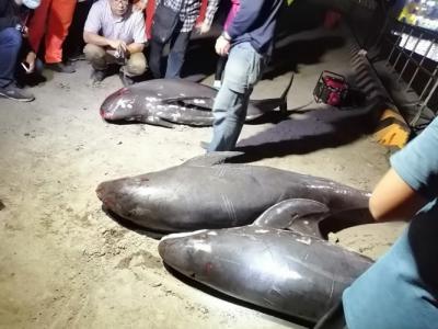 台湾高雄港发现3条小虎鲸搁浅 对开水域1
