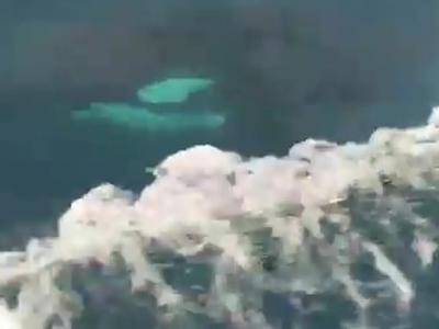 瓦杜里拍下短片,可见巨大的杀人鲸在船边伴游。杀人鲸的鳍肢高举水面。较早前意国海...