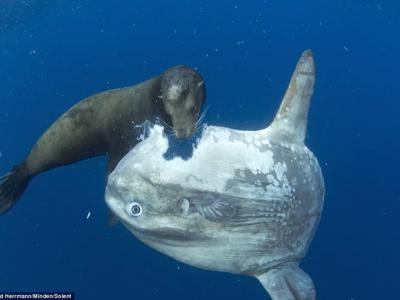 美国加州圣地牙哥外海2吨重迟钝翻车鱼(曼波鱼)被海狮啃了一...