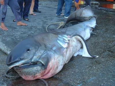 其中一条在花莲外海捕获的巨口鲨。台湾捕鲨问题严重。过去大量...