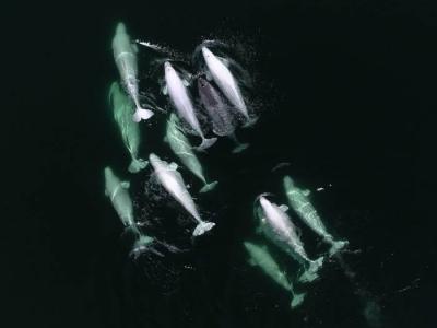 加拿大魁北克省圣劳伦斯河北部水域迷路独角鲸获好心白鲸群“收...