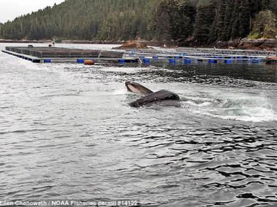 美国阿拉斯加州聪明座头鲸学会守在养殖场