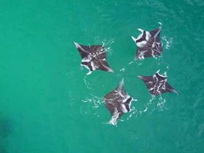 美国夏威夷欧胡岛海岸边无人机捕捉到鬼蝠魟独特的群...