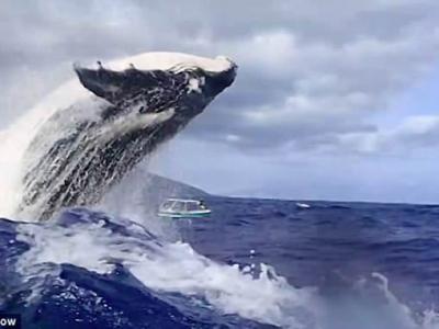法属玻利尼西亚座头鲸近距离跃水面,给潜水人士惊视...