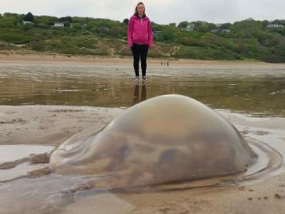 西威尔斯的沙滩惊现数以千计水母。部分水母非常巨型...