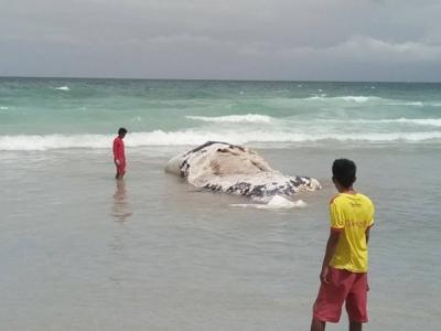 布吉一个海滩有抹香鲸搁浅。鲸尸发出阵阵恶臭。(神...
