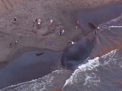 79呎蓝鲸伏尸美国加州沙滩 疑遭轮船撞死