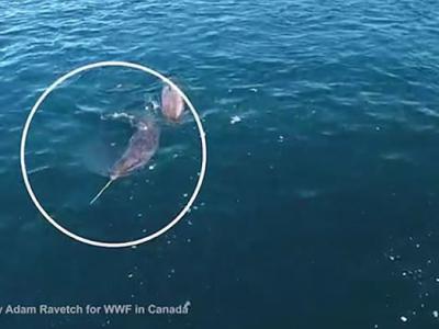 加拿大淳博雷海湾无人机拍摄到珍贵画面:独角鲸用长...