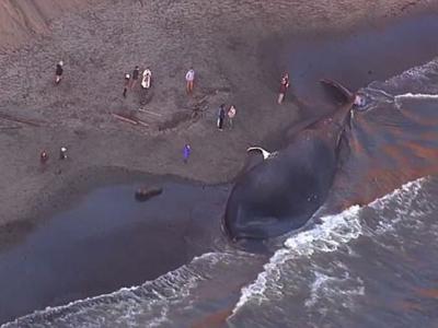 24公尺长蓝鲸肋骨全断搁浅美国加州博利纳