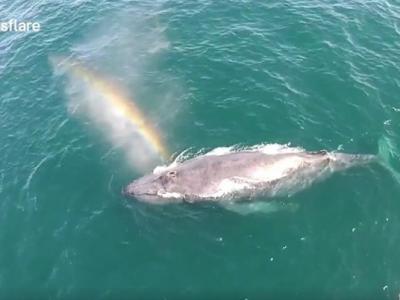 美国纽波特海滩座头鲸出海面换气时头部喷出一道彩虹...