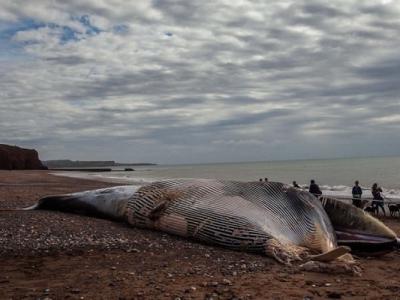 长须鲸搁浅英国南部德文郡沙滩 尸体膨胀