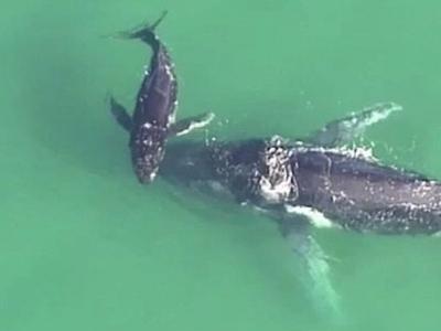 澳洲布里斯本母座头鲸不慎搁浅海滩 幼鲸
