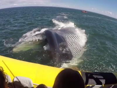 加拿大50吨巨大长须鲸游近观光船 侧身翻