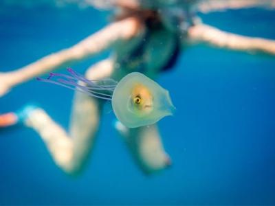 澳洲拜伦湾外海拍下鰺鱼被困在水母体内罕