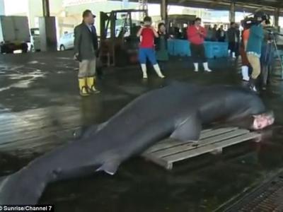 日本渔民意外捕获罕见5米长巨口鲨 视频:日本渔民意外捕获罕见5米长巨...