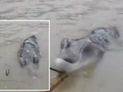 “不明生物”嘴部既长且扁,头顶还有两个“拱状”,有点像鳄鱼。 被捕获的“不...
