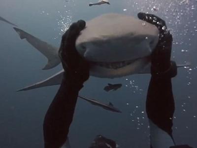 美国佛罗里达州勇敢潜水员拥抱鲨鱼建立友