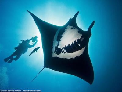 巴西水下摄影师在墨西哥潜水时拍到背部有酷似骷髅图案的蝠鲼 (神秘的地...