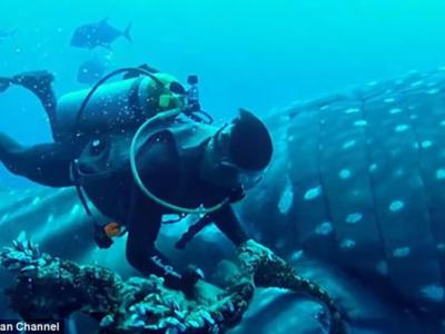 潜水员在墨西哥索科罗群岛海底帮鲸鲨去除缠绕在身体的钓鱼绳 (神秘的地...