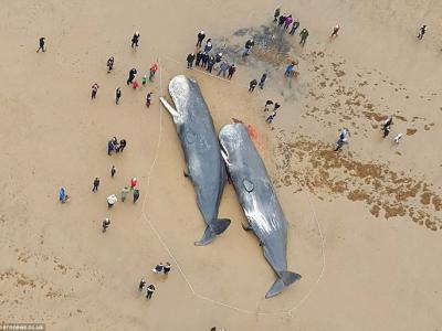 英国东北部的斯凯格内斯海滩上惊现4头死亡抹香鲸 (神秘的地球报道)英...
