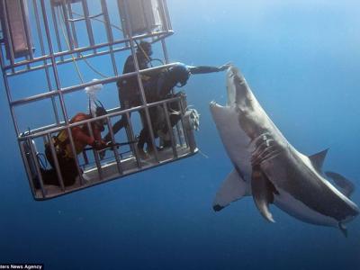 墨西哥瓜达卢佩圣母岛海岸潜水员向大白鲨投喂食物将其引诱至防鲨笼边 (...