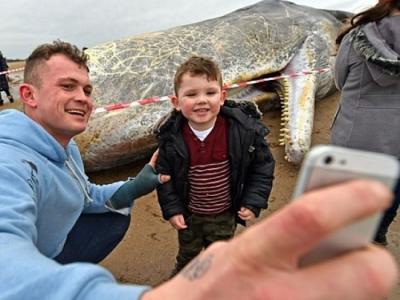 巨型抹香鲸尸冲上岸变景点 英国人自拍又
