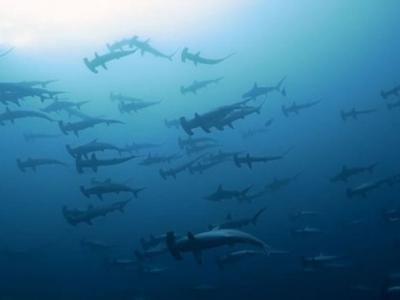 深海潜水员拍摄到60余头锤头鲨集体迁徙的
