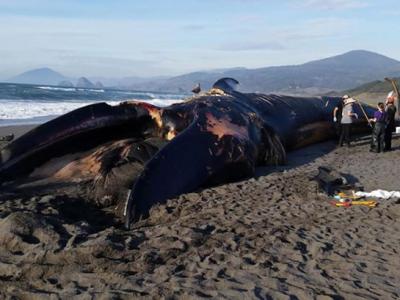 百吨蓝鲸被冲上美国俄勒冈州黄金海滩,厄尔尼诺现象为罪魁祸首 研究人员将去掉...