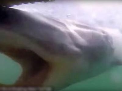 露出森森白齿的大白鲨 大白鲨头部一度穿过两道栏的中间,企图撕咬笼中的游客。...