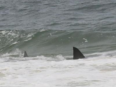 澳大利亚鲨鱼潜伏伺机向海滩上的鲸鱼尸体