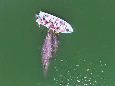 墨西哥海域灰鲸母子亲近游船任游客抚摸