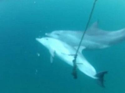 澳洲小樽鼻海豚误闯防鲨网被小鈎刺中 母