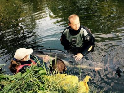 英国潜水者海洋生物救援会成员到场拯救该条海豚 由于水泡占海豚背部约25%,专...