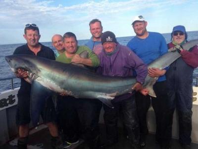 英国男子激战5个小时俘获一条大长尾鲨