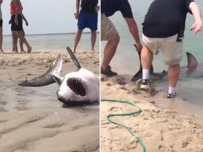 美国麻省大白鲨搁浅海滩 热心泳客救一命