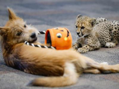 美国辛辛那提动物园孤儿猎豹Kris与小狗R