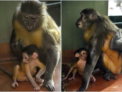 饲养员不希望打扰小猴和母猴。金肚白眉猴极为罕有。(神秘的地...