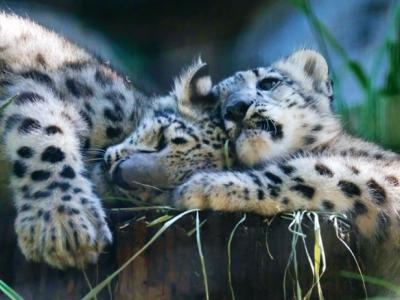 雪豹宝宝躺在妈妈的怀中。双胞胎雪豹宝宝外型相似。...