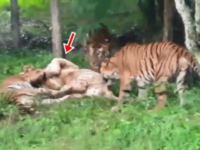 孟加拉白虎(红圈示)被数只孟加拉虎围攻。该只孟加...