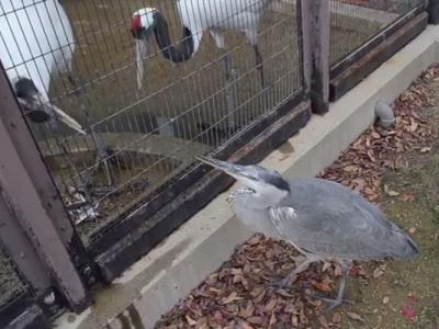 丹顶鹤从栅栏内,将饲料以嘴递给野生苍鹭。野生苍鹭...