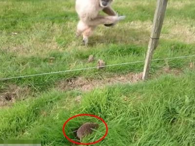 小刺猬(红圈)在草地上缓缓爬行。白色长臂猿看见小...