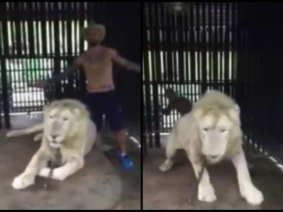 狮子突然站起身子。狮子面向游客作威吓状。视频:泰...