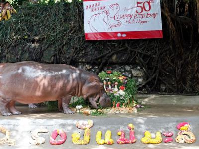 泰国萱律实动物园庆祝园内河马“玛丽”50岁大寿 (神秘的地球uux.cn报道)泰国萱...