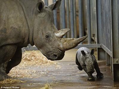 小白犀牛与母亲梅鲁舐犊情深 初生小白犀牛兴奋地在犀牛圈内到处跑 梅鲁最近...
