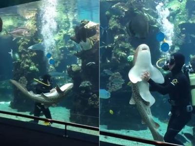 水族馆鲨鱼跟工作人员讨摸摸 舒服到瘫软