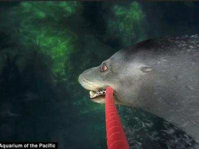 美国水族馆海狮Milo学会用“自拍棍”
