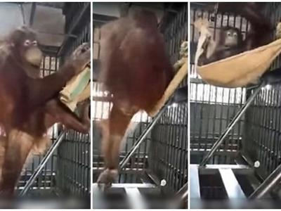 泰国动物园猩猩会自己做吊床 内莫对自己的吊床相当满意 (神秘的地球报道)猩...